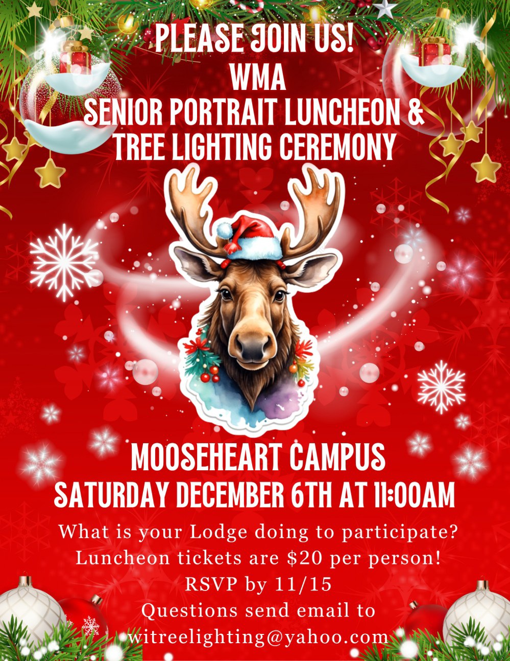 Why is it that the old adage “don’t blink” becomes more true each year? Once again, we are all in the early stages of planning for the upcoming holidays. Now is the time to make sure you are attending the Wisconsin Moose Association Senior Portrait Luncheon and Tree Lighting Ceremony. The annual event is scheduled for Saturday, December 6th, at 11:00 am on the Mooseheart Campus.