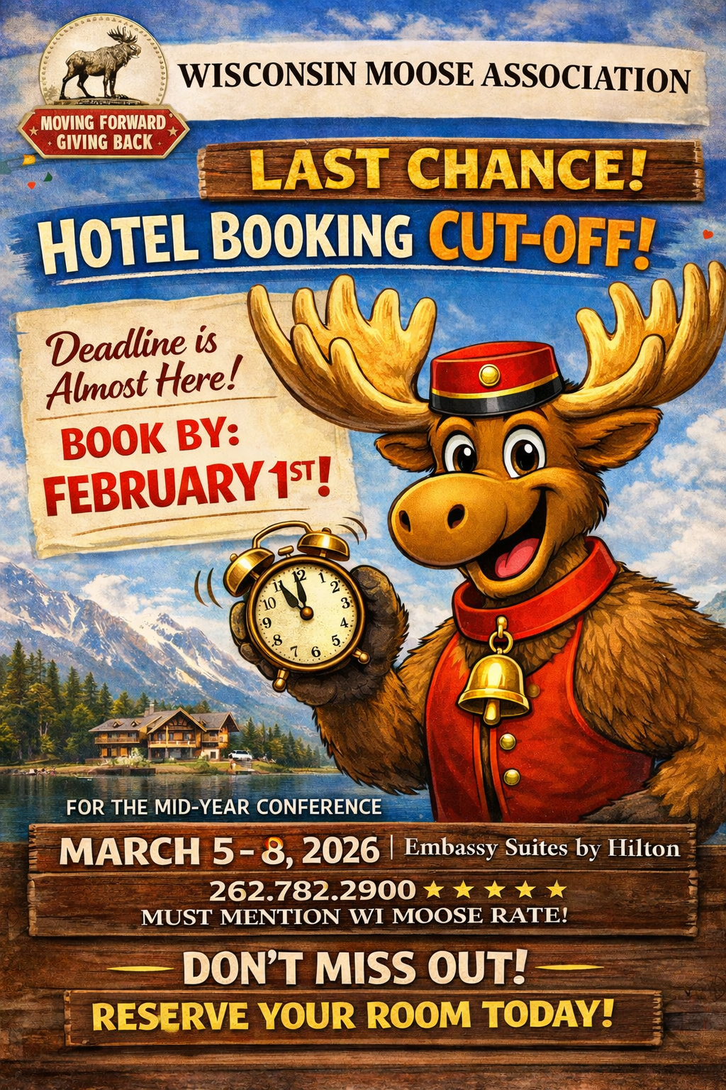 Reminder : The Mid-Year Conference is quickly approaching. Cutoff date for Moose Rate is February 1, 2026 .Embassy Suites by Hilton 1200 S. Moorland Rd March 5 - 8, 2026 Brookfield, WI 53005 262.782.2900 BE SURE TO MENTION WI MOOSE RATE Theme For Conference is Patriotic